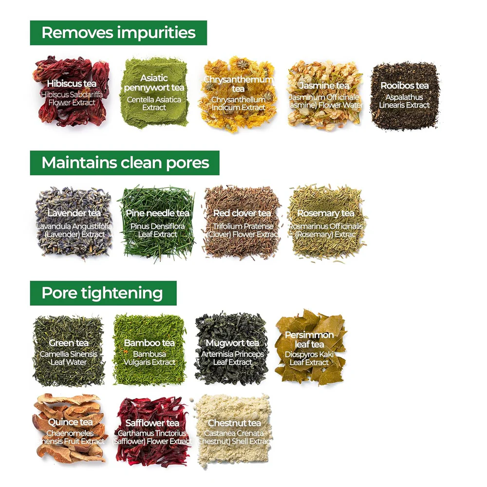 ● Contains 240,000ppm of green tea water, 16 tea extracts, and 5,000ppm of naturally derived BHA for brighter skin.