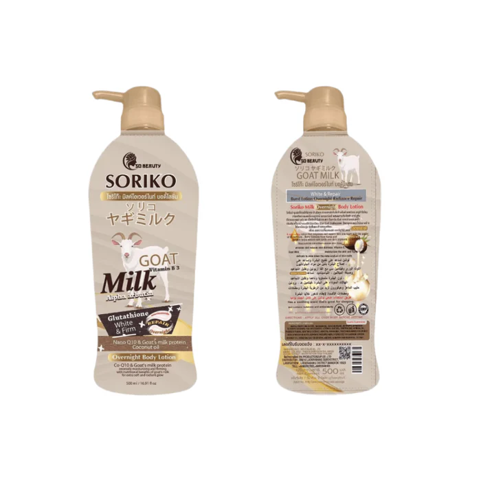 • Soriko So Beauty Goat Milk Overnight Body Lotion is a skin nourishing lotion that uses the power of goat’s milk to provide essential vitamins and moisturizing benefits. With Nano Q10, Glutathione, Berry Complex Extract, and other natural ingredients, this lotion works to brighten, repair, and rejuvenate skin overnight. Say hello to healthy, radiant skin with this nourishing and effective lotion. Made in Thailand.